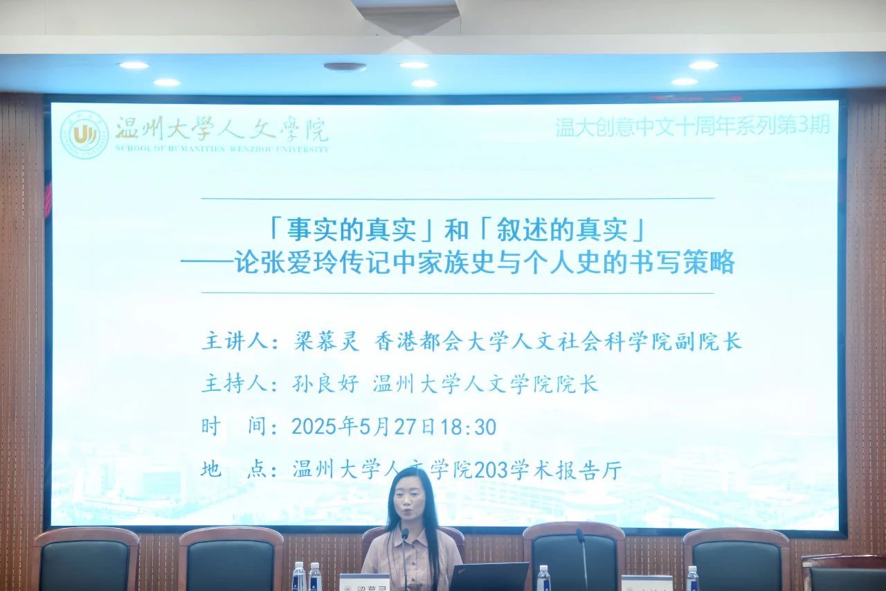 2025年5月27日晚,我院特邀香港都会大学人文社会科学院副院长、田家炳中华文化中心主任梁慕灵,在203学术报告厅开展以“‘事实的真实’和‘叙述的真实’——论张爱玲传记中家族史与个人史的书写策略”为主题的讲座。讲座由我院院长、图书馆馆长孙良好教授主持,参与讲座的听众有香港都会大学人文社会科学院的邵栋博士、余文翰博士、awc777万象城娱乐官网创意中文系副主任李广旭老师、刘卫东老师以及本研学生。现场师生积极参与学习与讨论,学术氛围浓厚。