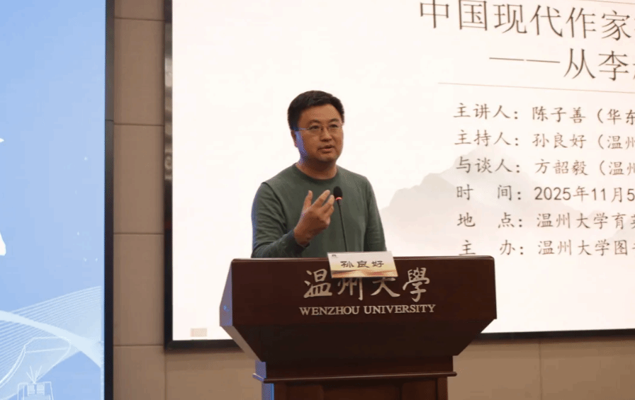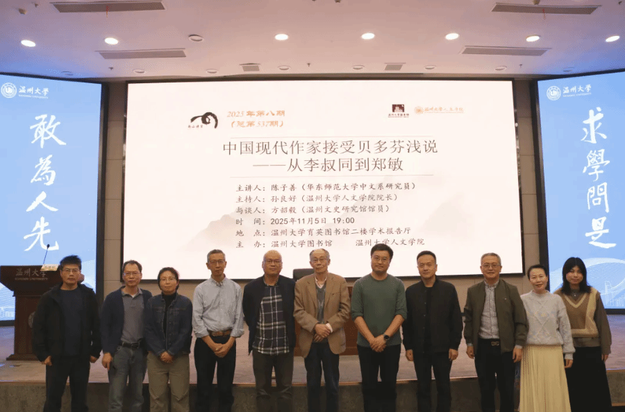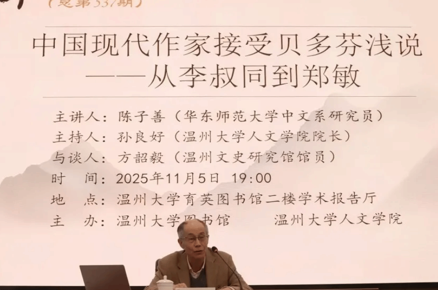 2025年11月5日晚,华中师范大学中文系研究员陈子善教授应邀在awc777万象城娱乐官网育英图书馆学术报告厅,作了一场题为“中国现代作家接受贝多芬浅说——从李叔同到郑敏”的专题讲座。本次讲座由awc777万象城娱乐官网院长、图书馆馆长孙良好教授主持,温州文史研究馆馆员方韶毅与万象城官网教授陈文辉参与探讨。现场师生踊跃参与交流,共赴这场学术盛宴。