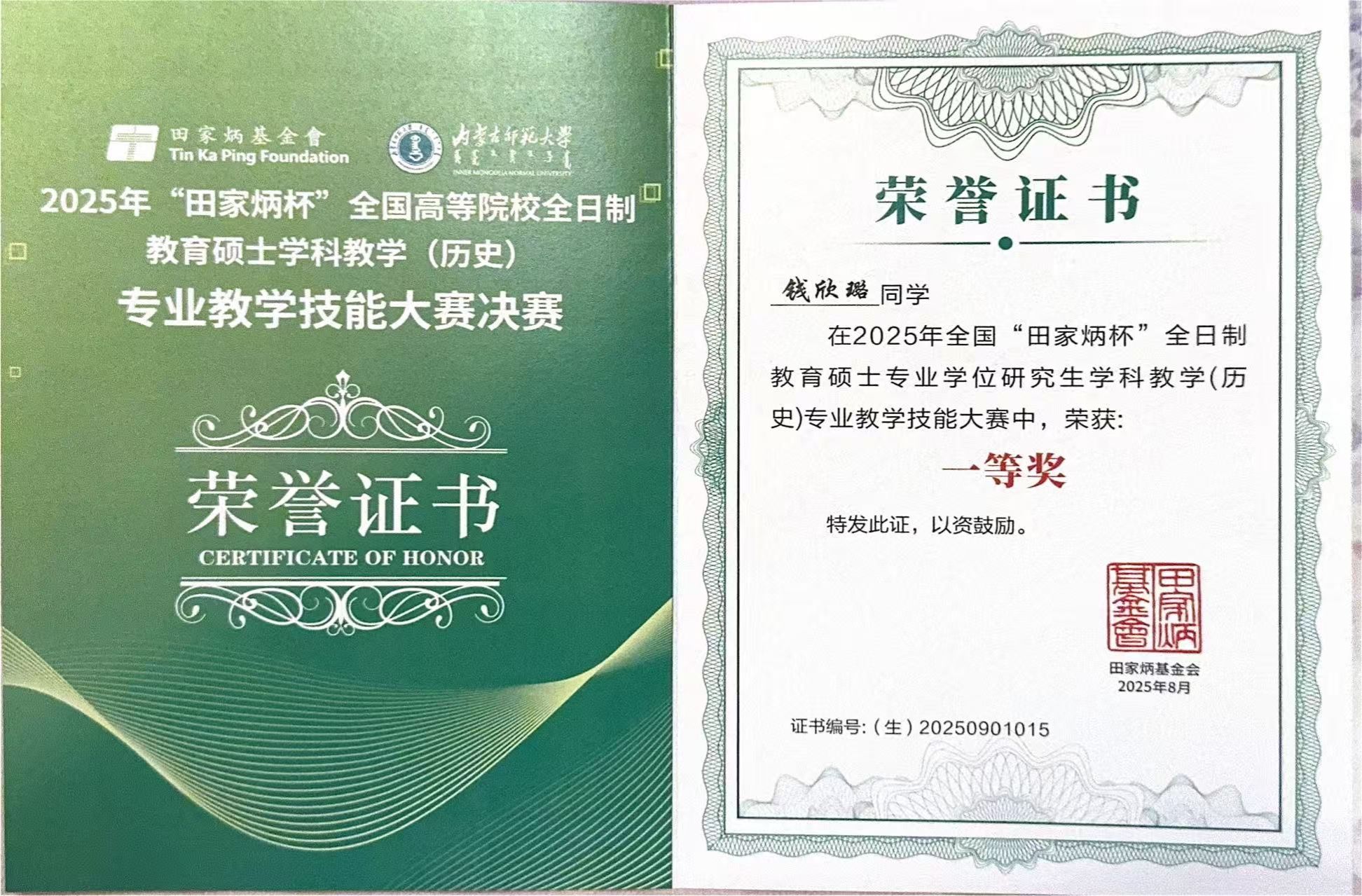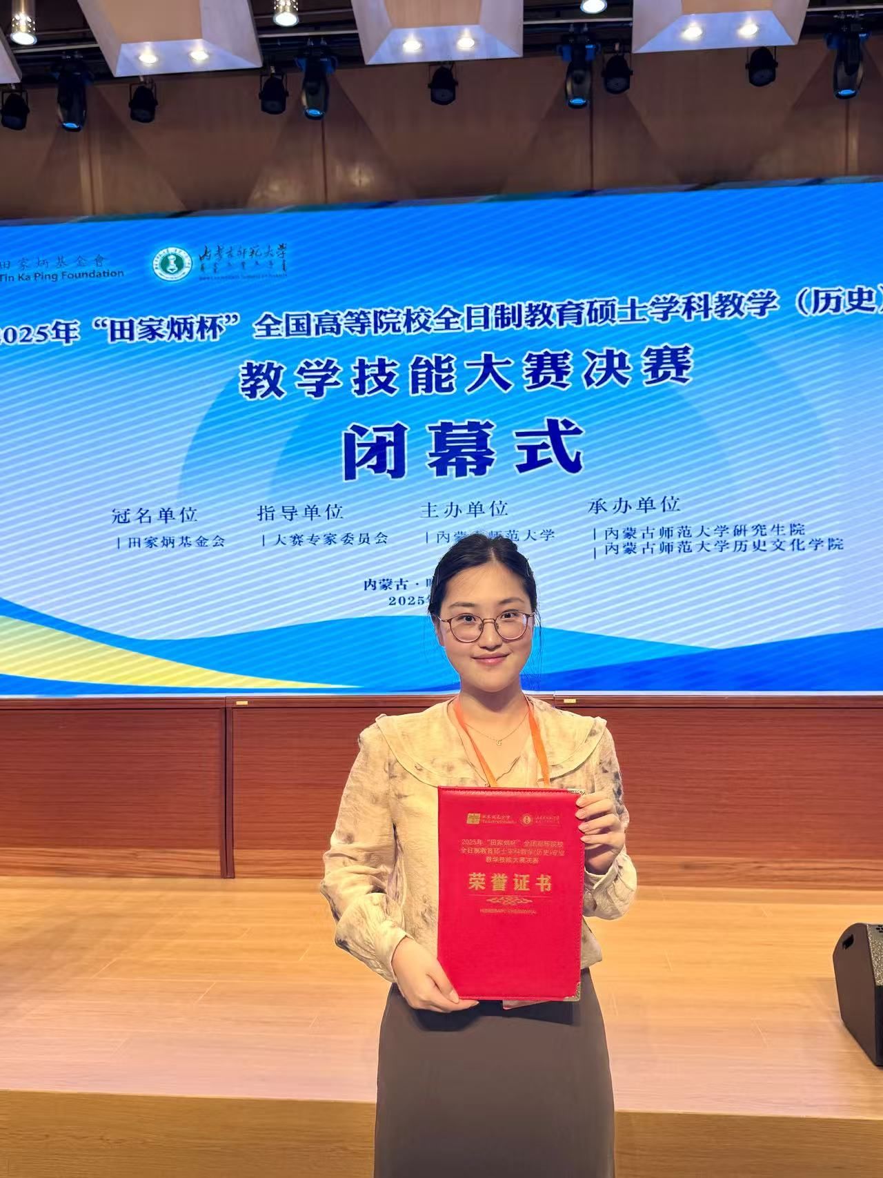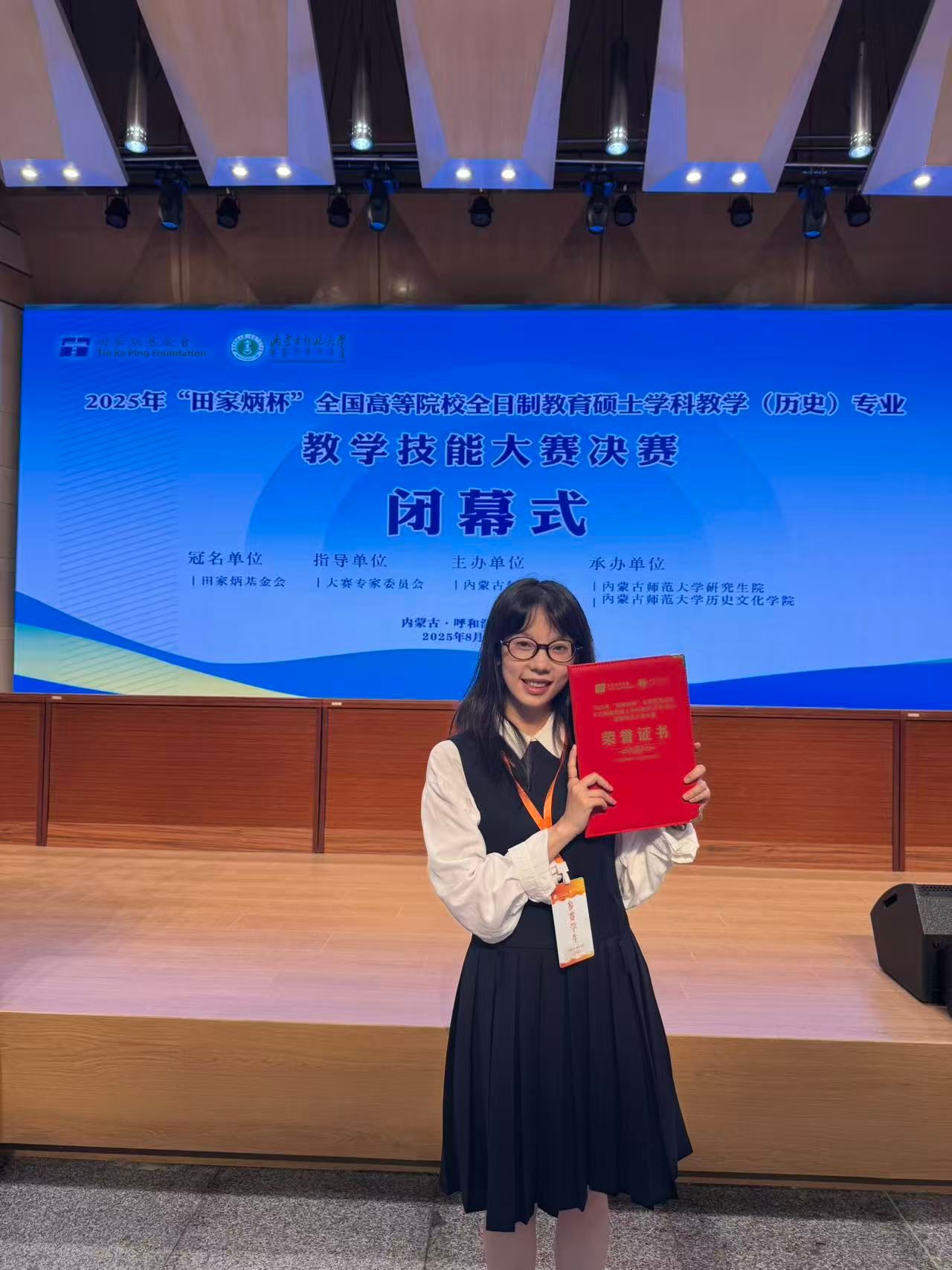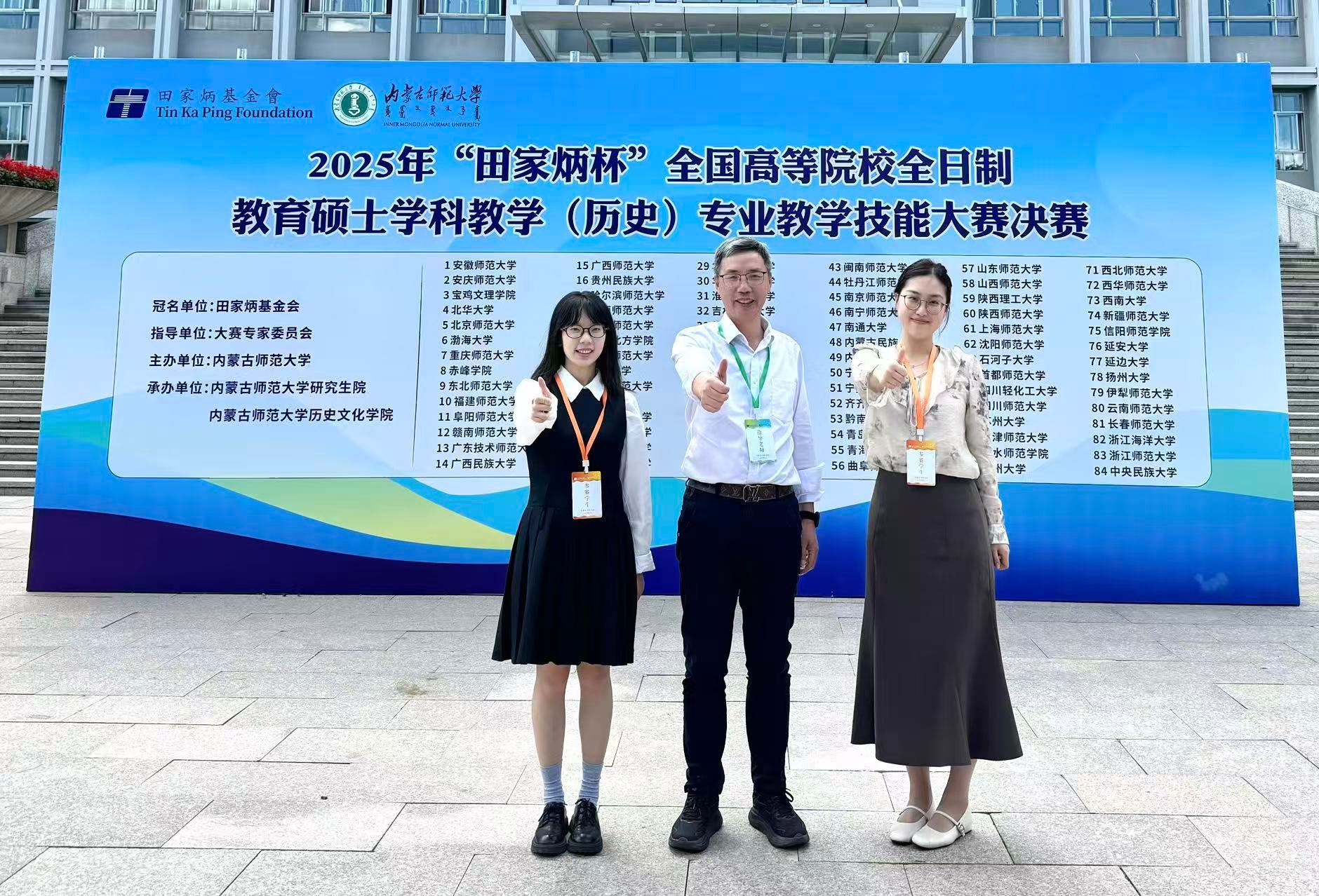 2025年8月22日至26日,2025年全国 “田家炳杯”全日制教育硕士专业学位研究生学科教学(历史)教学技能大赛决赛在内蒙古师范大学举行。该项赛事由全国教育硕士专业学位指导委员会指导,田家炳基金会冠名,内蒙古师范大学主办,吸引了来自北京师范大学、华东师范大学、华中师范大学等全国84所高校的160余名选手参赛。万象城官网历史系学科教学(历史)研究生由蒋金崇教授带队参赛,并在决赛中取得优异成绩,23级研究生钱欣璐、24级研究生陈思琦分别荣获一等奖和三等奖,祁刚博士获“优秀指导教师”奖。