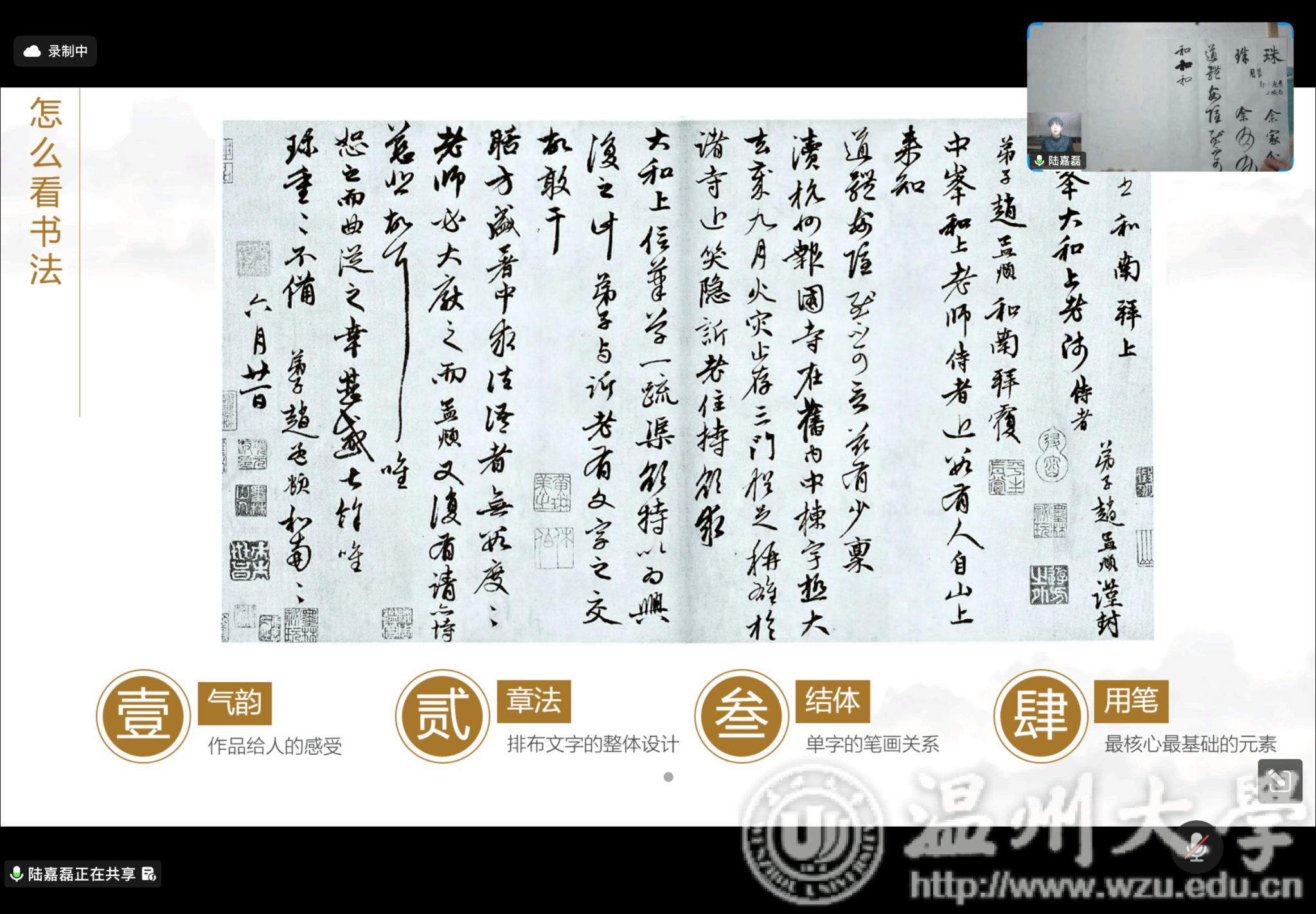 11月30日晚上,最后一场线上讲座由awc777万象城娱乐官网美术与设计学院讲师、中国美术学院博士、浙江省青年书法家协会篆刻委员会副秘书长陆嘉磊老师主讲,主题为“书法艺术的审美与书写——以赵孟頫为例”。