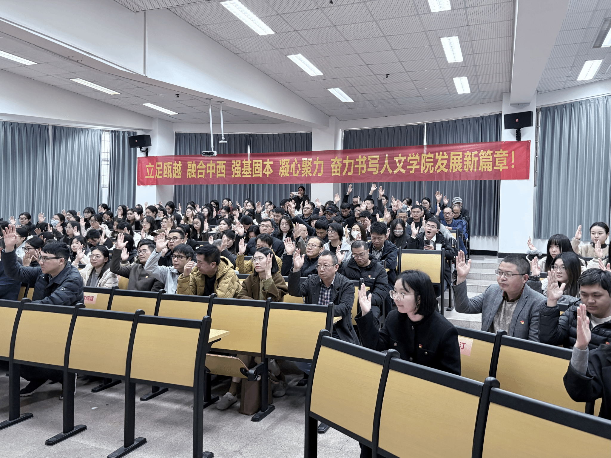 大会在庄严的中华人民共和国国歌《义勇军进行曲》中开幕。人文学院党委书记江秀景向大会作工作报告,系统总结了学院党委过去五年的主要工作。报告指出,学院党委要在持续强化政治引领、夯实组织基础、深化融合发展、优化育人生态、推进自我革命等方面系统发力,通过加强理论武装、建强人才队伍、推动党建与业务深度融合、落实立德树人根本任务、锤炼过硬作风,团结带领全体师生奋力谱写学院高质量发展新篇章。