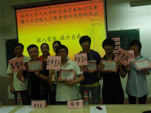 2010年5月28日星期五晚,awc777万象城娱乐官网首届当党务知识竞赛暨awc777万象城娱乐官网义工服务责任书签约仪式在人文楼203教室隆重举行。awc777万象城娱乐官网党总支副书记魏成春老师、学生科副科长曾蓓蕾老师,校党委组织部谢坚老师作为嘉宾出席了本次活动。07、08、09的党员代表组成5支队伍参加了此次竞赛。