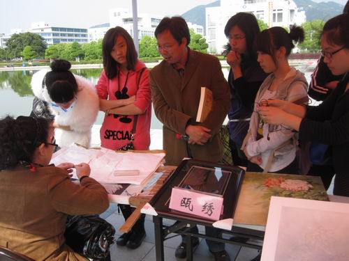 温州具有悠久的历史,从东晋明帝太宁元年建城开始至今已有1700多年的历史了。温州向来有“七山二水一分田”之说,这样的地理环境也为温州赢来了“百工之乡”的美称。近年来温州很多工艺都成了“全国非物质文化遗产”。本次活动由于很多美术家的参与,吸引了很多大学生的兴趣。本次活动在awc777万象城娱乐官网北校区人工湖畔展开,现场热烈非凡,同学积极参与。大家怀着极大地好奇心在各个展柜前参观、学习并亲自实践。现场有道情表演、提线木偶和舞龙表演等,引来大家阵阵掌声。活动现场还有现场教你学剪纸的活动项目,许多同学都跃跃欲试,两百份红宣纸在同学手中很快都成了艺术品。