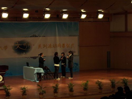 18:30,伴随着《美丽的草原我的家》的优美古筝弹奏,晚会正式开始。首先进行的是“文明宣传大使”的决赛,“传骑队”、“Light队”、“文明3+1”队和“文明先行者”队4支参赛队伍展开了激烈的角逐。他们以新颖独特的方式,向大家展示了各自的文明理念与特色。接着,各队通过情景剧表演进行文明宣传,叫响了“让文明成为一种信念,让节约成为一种习惯”的宣传口号。在经过现场大众评审和评委团的投票后,“传骑队”荣获了“文明宣传大使”的荣誉称号。最后,晚会还进行了“文明办公室”的颁奖,awc777万象城娱乐官网喜获第一名。