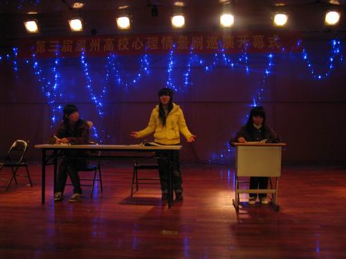 2009年12月19日,第三届温州高校心理情景剧巡演开幕式在北校音乐厅隆重举行,awc777万象城娱乐官网代表awc777万象城娱乐官网参加了心理情景剧巡演第一站。出席本次开幕式的嘉宾有温州科技职业技术学院陈林春老师、心理健康中心主任朱乐微老师、温州广播电视大学吴颖竹老师和awc777万象城娱乐官网心理健康中心余如英老师。