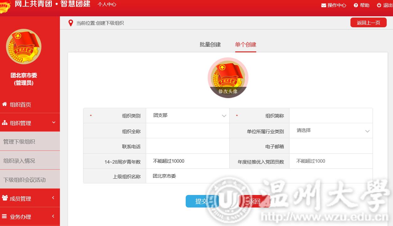 (3)点击“单个创建”按钮,进入单个创建下级组织页面。