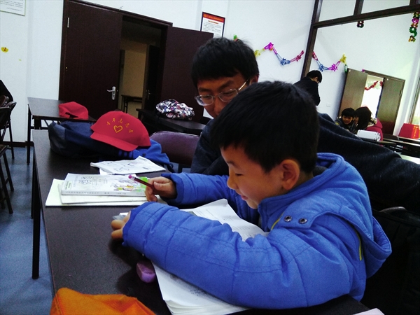 中午12点40志愿者们在南校南大门集合,乘坐111路公交车前往养老服务中心,40分钟的车程后,到达目的地,志愿者们开始整理场地,迎接孩子们的进场,对孩子们和志愿者们进行分配,对接下来的活动进行准备的时候让志愿者们辅导孩子们家庭作业,孩子们在来之前就完成了大部分的作业,志愿者们对孩子们的已经完成的作业精心检查,在发现错误后及时指出讲解并让孩子们改正。数学,语文,英语各样的科目的作业都在志愿者的讲解下逐渐地改正完成。在一个小时过去后,孩子们有些疲惫,志愿者们就让小朋友们放下作业,开始和孩子们聊天,画画,玩游戏。在稍事休息之后,孩子们更好的进入了学习的状态,开始完成自己剩下的作业。3点30分,孩子们陆续完成了自己的作业,志愿者们让孩子们坐在自己的位置保持安静,开始第二个活动,由主持人向孩子们讲解有关地球一小时的相关知识并在讲解过程中与孩子们进行互动,在讲解完毕后,主持人发下地球一小时活动的活动倡议书,让每个小朋友和志愿者们签上自己的名字,接着孩子们在黑板上画下自己想象关于地球一小时活动的图形,孩子们纷纷拿起粉笔在教室前的黑板画下各种各样的灯泡、树木、地球的形状的画。在黑板被填满之后,志愿者们与孩子们开始拍摄大合照。随后,孩子们收拾好自己的作业被陆续接回家去,志愿者们开始收拾场地后离开。