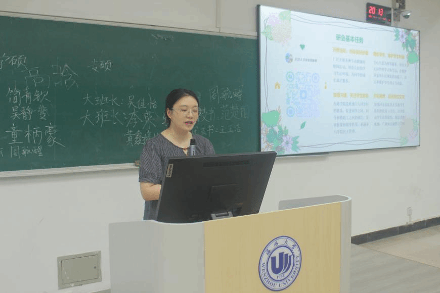 随后,辅导员张丹妮老师就在校生活与学业方面向新生进行讲解。她详细介绍了awc777万象城娱乐官网研究生相关网站资源和管理系统,以及奖助学金申报、评奖评优等事宜,并就公寓安全卫生、校园安全、意识形态等事项进行着重强调,为新生快速适应校园生活提供全面指引。