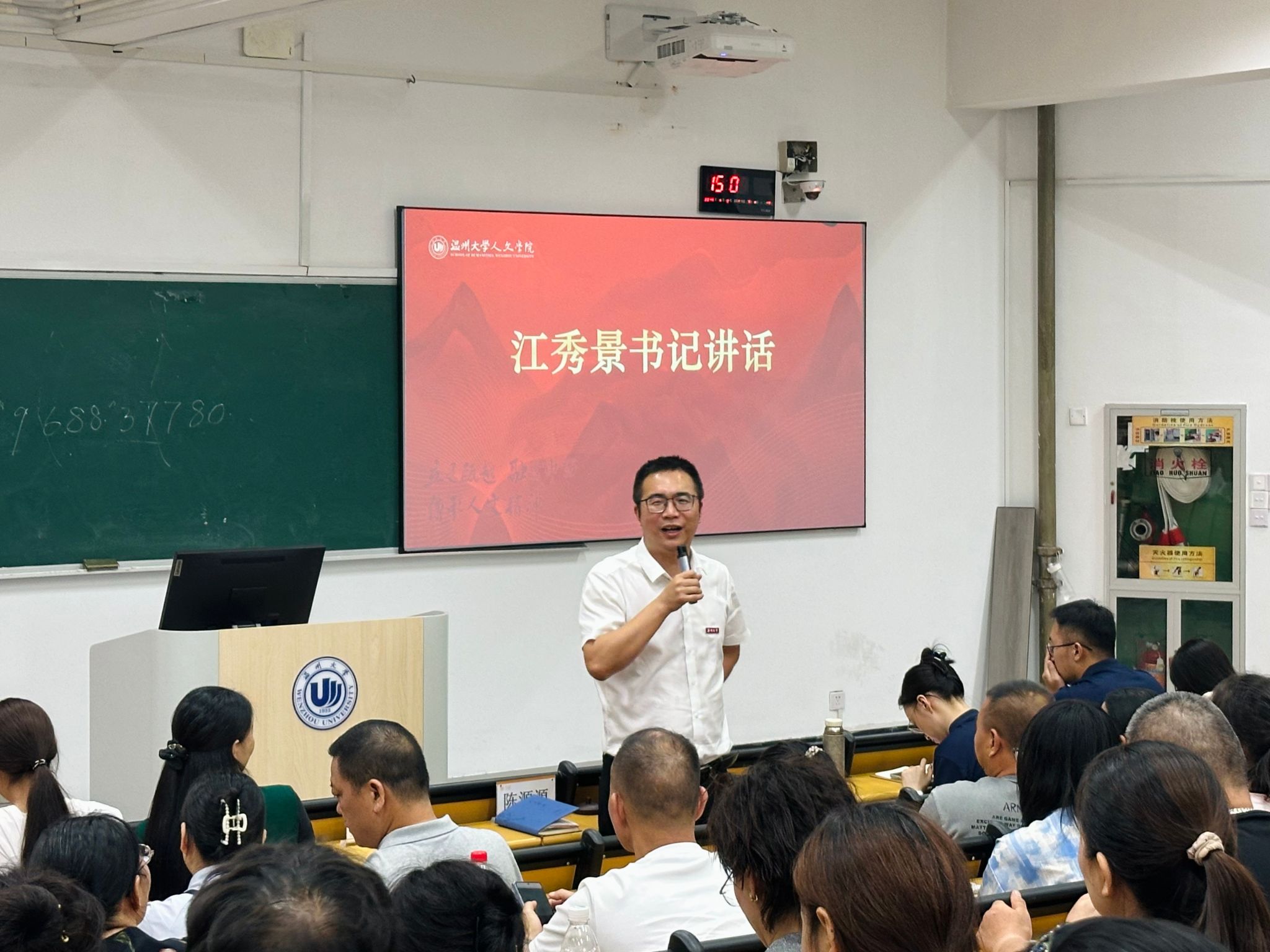会议最后,学院党委书记江秀景发表总结讲话。他重点强调,学院将始终把落实“立德树人”这一根本任务摆在育人工作的首位,依托人文类学科的独特优势,引导学生涵养家国情怀、塑造高尚品格。同时,江秀景书记指出,大学是学生“三观”塑造的关键阶段,学院将持续筑牢意识形态防线,通过课堂教学、主题教育、文化活动等多元载体,教育引导学生站牢政治立场,树立正确价值观。最后,他也期待家长们能与学院同向发力,共同助力学生成长为有理想、有本领、有担当的时代新人。