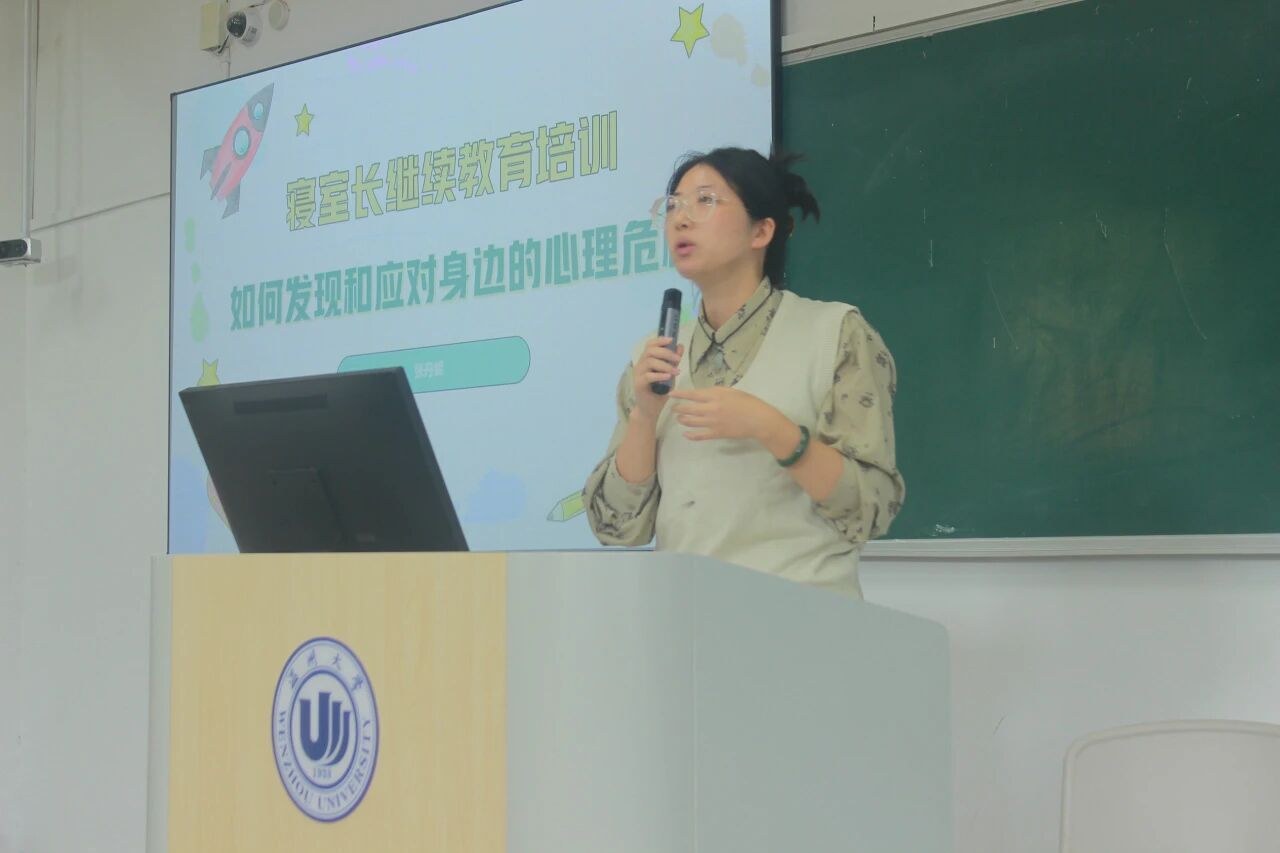最后,张丹妮老师针对寝室长们开展心理健康工作培训。心理危机隐患在大学生群体中不可被忽视,寝室长应该提高对心理健康问题的认知能力,及时发现和应对身边的心理危机。对于身边需要帮助的室友和同学,寝室长也应当及时伸出援手,采取正确的应对措施。