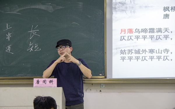 首先,唐老师和同学们交流了几个关于非遗与声调的问题,在了解同学们认知的基础上,由浅及深地介绍语言音调的内在发展规律。随后唐老师以温州话为例,并播放几段诗歌的吟诵音频,让同学们真切地体会到四声八调的不同,感受到音律的独特韵味。配上音调的古诗词,仿佛被赋予了魔力,在平平仄仄的起伏中给人以别样的美感。唐老师以他生动的讲述、专业的吟诵知识、满满的人文情怀,带领同学们在优美的词章情韵中,感受古韵的魅力,与古人进行心灵的对话。最后,在一片热烈的掌声中,本次讲座圆满结束。