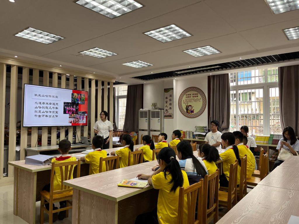 为推动畲族文化传承和发展,实践队针对当地情况,设计了教畲语、画畲服的专项课堂。来自畲族的主讲员蓝栀烨从最简单常用的畲族日常用语入手,就畲语的基本特点、基本发音、会话及畲歌的基本知识、对歌要领等内容对孩子们进行讲解。蓝栀烨同学对小朋友们说:“我们畲族没有文字,畲歌都是靠口口相传的形式一辈一辈地传下来的,希望能够通过教大家唱畲语畲歌,让畲族文化更好地传递下去。”